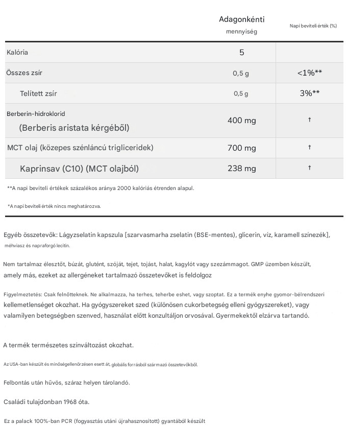 Berberine HCL 400mg, MCT olaj 700mg, Kaprinsav (C10) (MCT olajból) 238mg